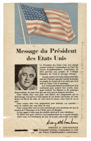 In an attempt to sway both the Vichy French and the North African natives to the Allied cause, thousands of leaflets were dropped over North Africa prior to the landings in November 1942. This leaflet was picked up in Oran, Algeria, by Oscar Rich, who landed there as a member of the 1st Quartermaster Battalion, 1st Infantry Division. The leaflet, printed in French on one side and Arabic on the other, reads in part: