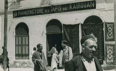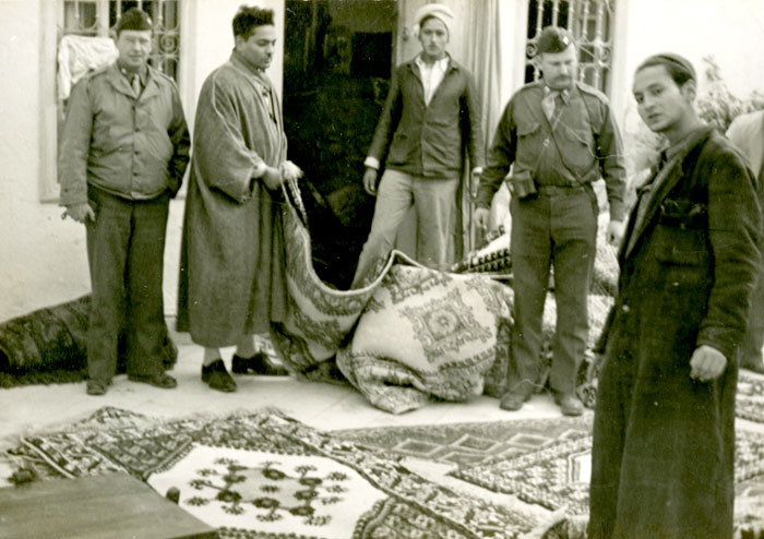 Tunisian men showing carpets and rugs to American officers. Tunisia, North Africa. 1943–44.